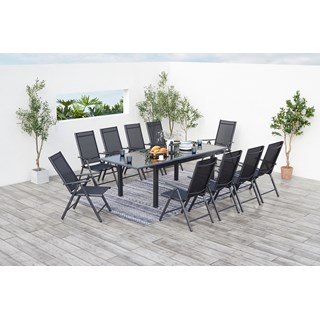 Ce magnifique salon de jardin 10 places est composé d'une table en aluminium recouverte d'une belle plaque de verre noire d'une épaisseur de 5 mm. Elle mesure 75 cm de haut pour une longueur de 1,60 m à 2,40 m en utilisant la rallonge d'un mètre. Ses dix larges fauteuils en aluminium et en toile en polyester gainée de PVC ultra résistant sont inclinables et pliables. La dimension de l'assise est de 56x65.5 cm, la hauteur va de 84 à 107 cm selon l'inclinaison que vous choisirez.