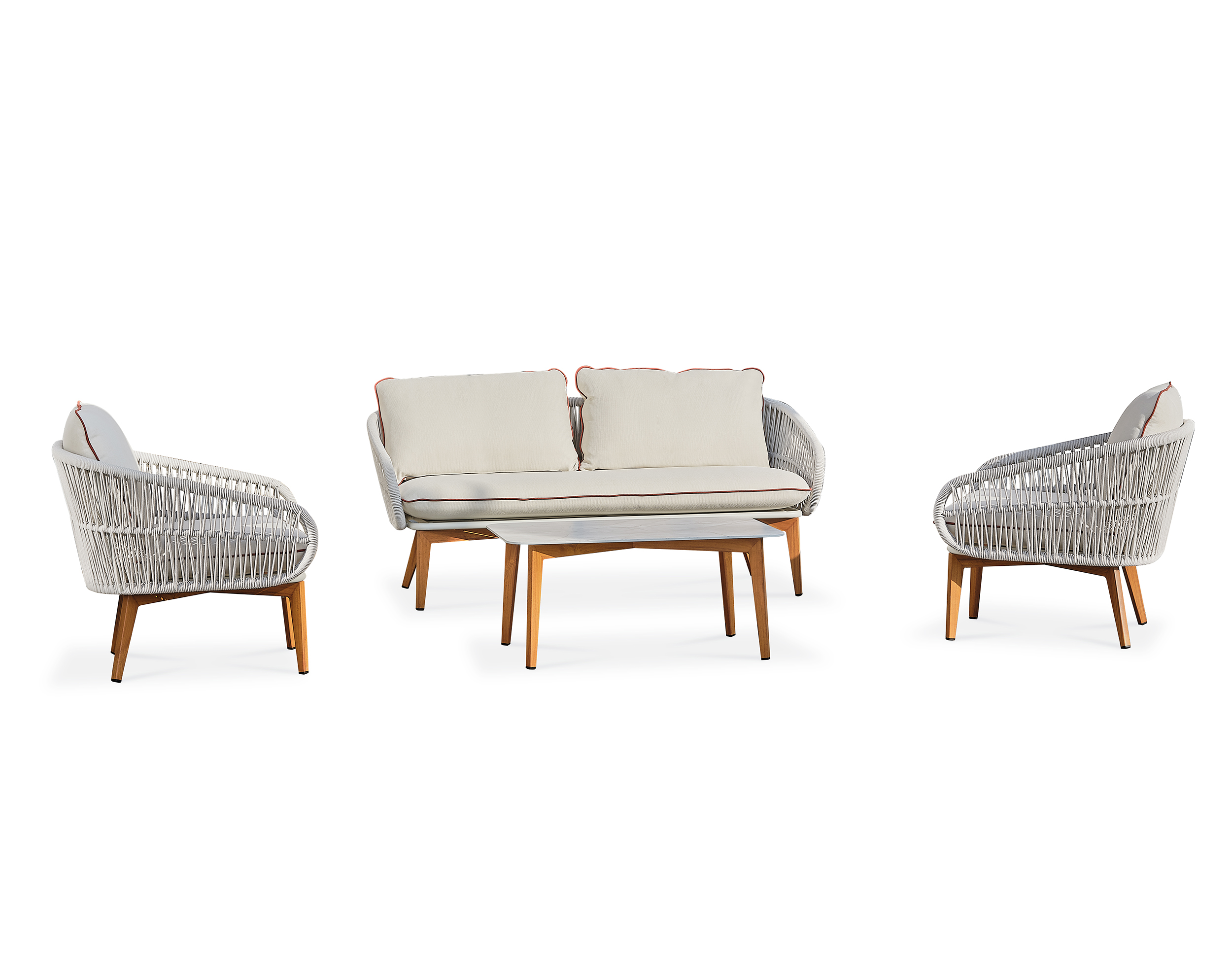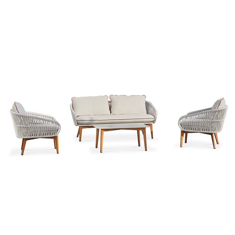 Salon de jardin CUZCO 5 places en aluminium imitation bois et corde tissée grise, composé d'une table basse avec plateau en verre finition céramique, d'un canapé 3 places et de 2 fauteuils. Coussins 100% polyester blanc.