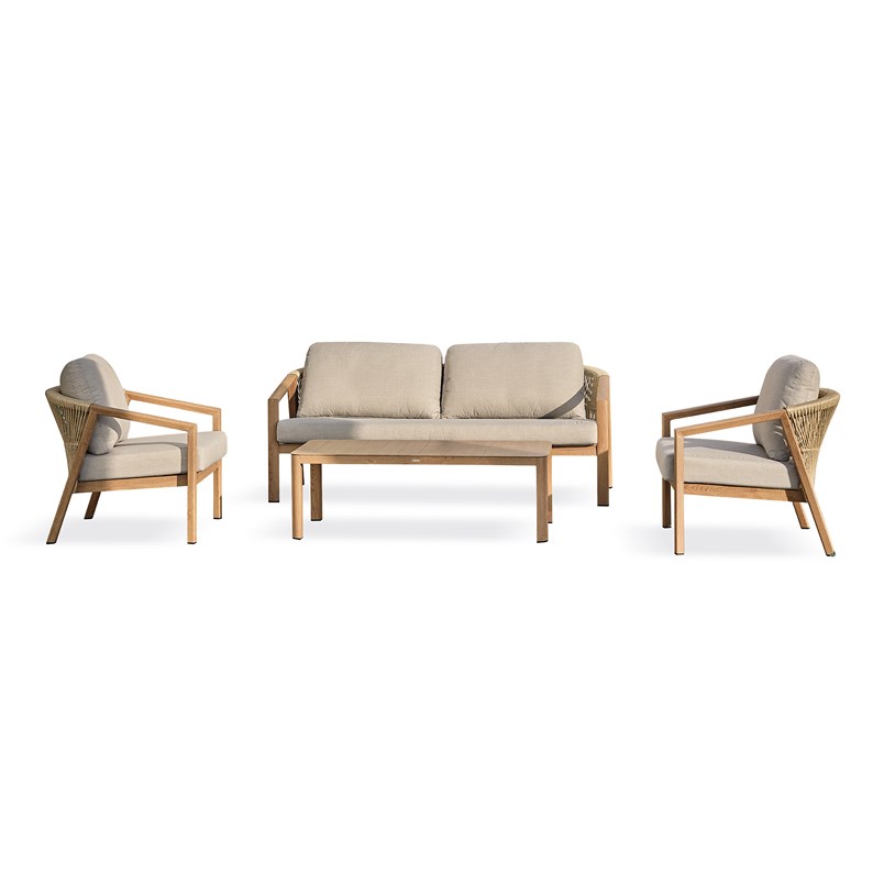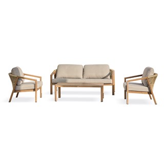 Salon de jardin GOYA 5 places en aluminium imitation bois, composé d'une table basse, d'un canapé 3 places et de 2 fauteuils surmontés d'un tissage en osier rond coloris naturel. Coussins 100% polyester gris.