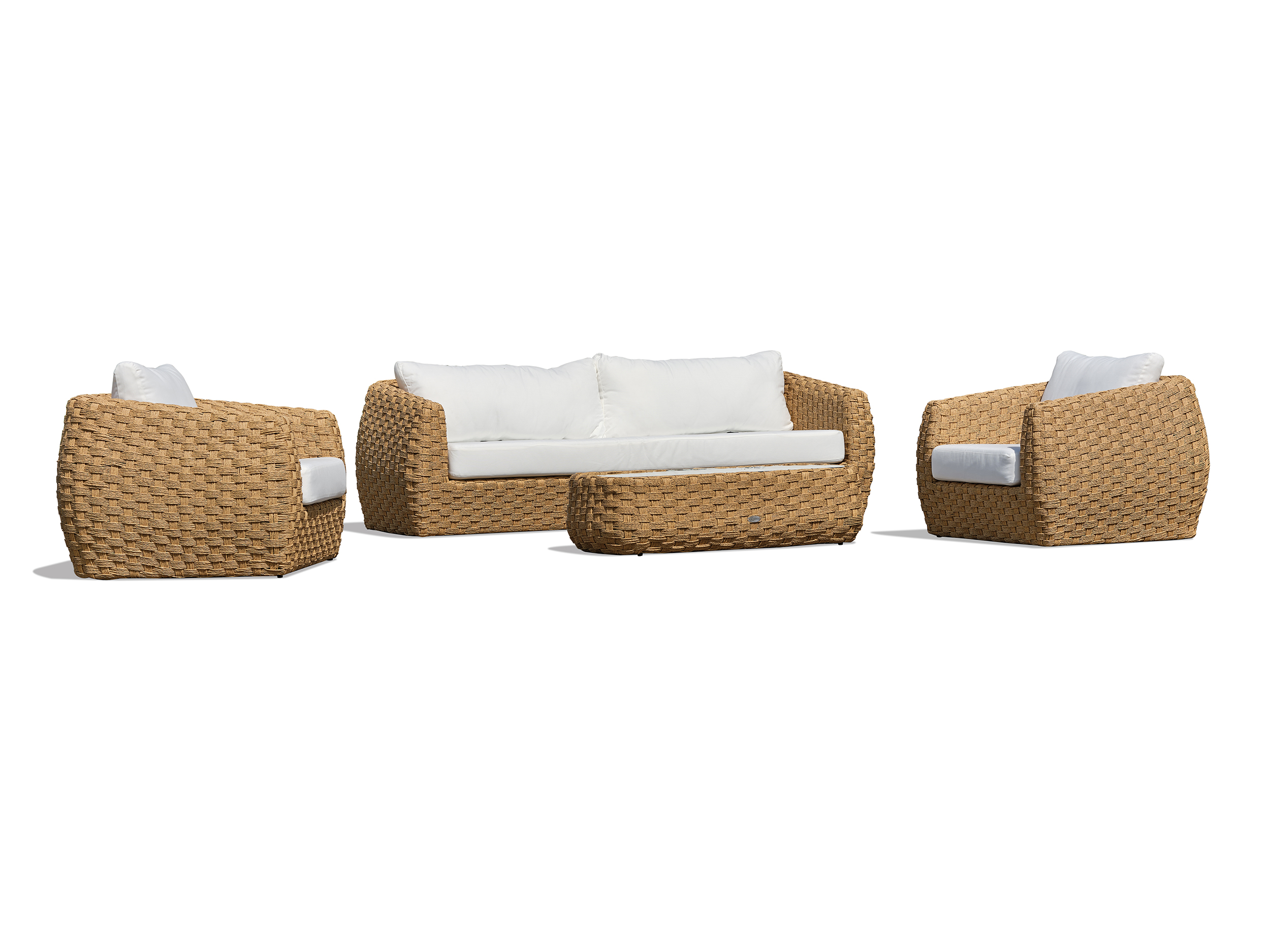 Salon de jardin RAMATUELLE 5 places en aluminium et résine tressée, composé d'une table basse, 1 canapé 3 places et 2 fauteuils. Coussins 100% polyester blanc.