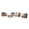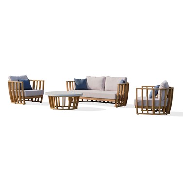 Salon de jardin BOGOTA 5 places certifié FSC® 100% en bois d'acacia, composé d'une table basse avec plateau effet béton, d'un canapé 3 places et de 2 fauteuils. Coussins 100% polyester écru.