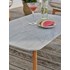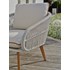 Salon de jardin CUZCO 5 places en aluminium imitation bois et corde tissée grise, composé d'une table basse avec plateau en verre finition céramique, d'un canapé 3 places et de 2 fauteuils. Coussins 100% polyester blanc.