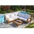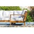 Salon de jardin MAJORQUE en aluminium effet bois composé de 2 banquettes 2 places, d'une table basse et d'un module d'angle. Table basse de jardin carrée avec plateau amovible. Coussins déhoussables 250 g/m² garni polyester (20kg/m3).