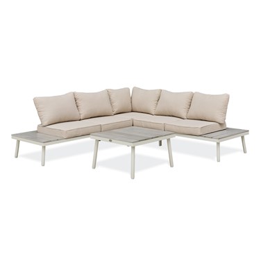 Salon de jardin d'angle OSAKA 5 places en aluminium blanc et aluminium aspect bois grisé, composé d'une table basse avec plateau et 2 méridiennes avec tablettes, en aluminium aspect bois grisé.