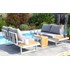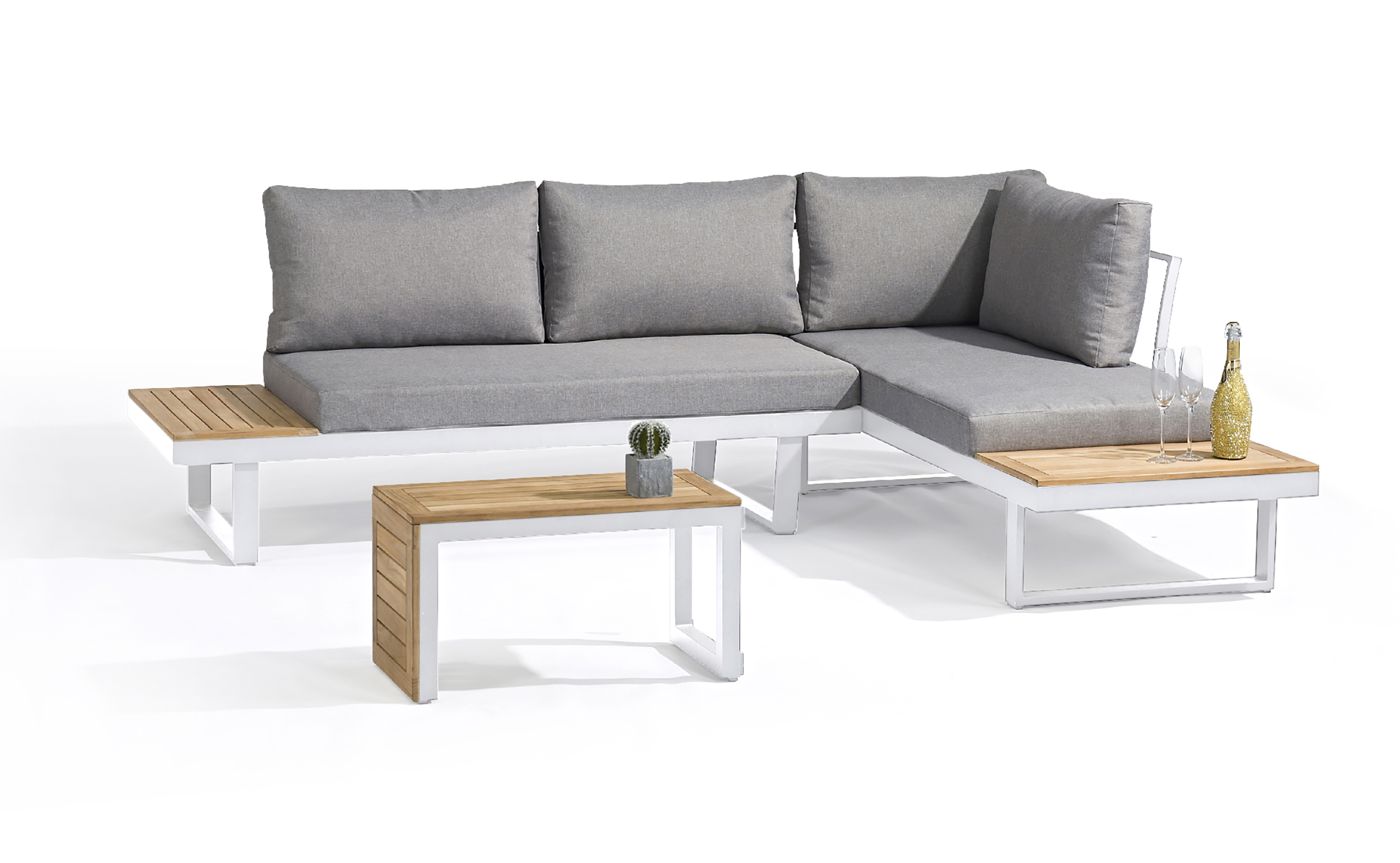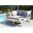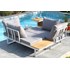 Salon de jardin TOKYO certifié FSC® 100% en bois d'acacia et structure aluminium, composé de 2 méridiennes 2 pl, d'une table basse. Coussins déhoussables 100% polyester gris clair. Salon modulable : version salon d'angle, lit, face à face, 2 banquettes.