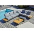 Salon de jardin VANUATU certifié FSC® 100% en bois d'acacia, aluminium anthracite, composé de 2 méridiennes 3 pl, 1 table basse plateau bois d'acacia et 1 tablette en aluminium. Coussins déhoussables en toile 100% polyester grise.