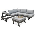 Salon d'angle de jardin NEWYORK en aluminium, composé d'une table/pouf, d'une méridienne 3 places, d'une banquette 2 places avec assises inclinables. Coussins déhoussables 250 g/m² garni polyester (20kg/m3).