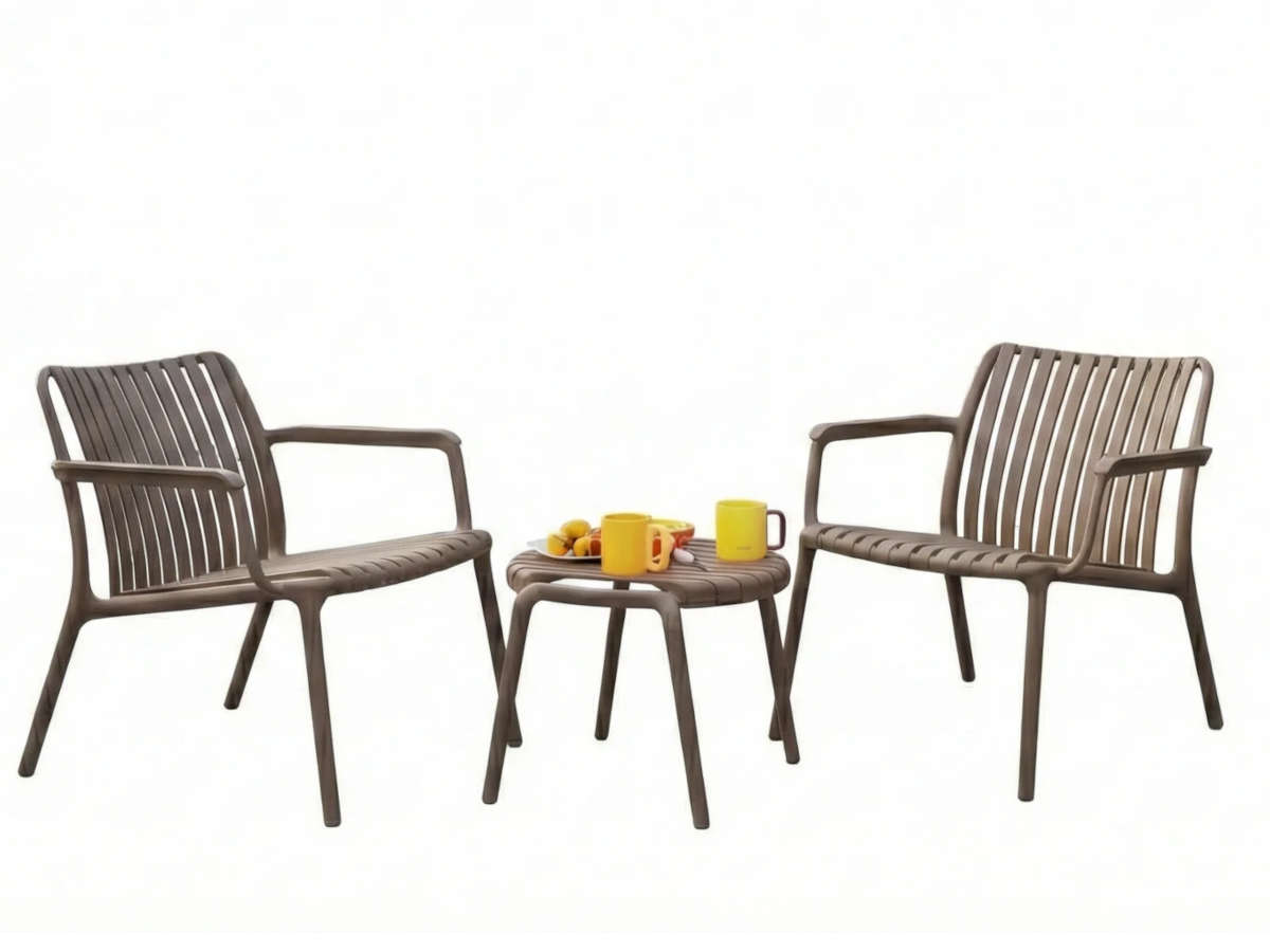 Conçu pour la détente, cet ensemble comprend 2 fauteuils enveloppants confortables et 1 table basse assortie, parfaits pour partager un moment convivial en plein air.