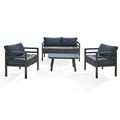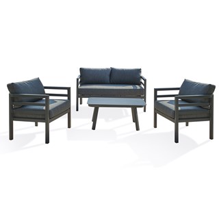 Salon bas de jardin LISBONNE en aluminium/strong> composé d'un canapé 2 places, 2 fauteuils, une table basse, 3 coussins d'assises et 4 coussins de dossier. Tous les coussins sont déhoussables.