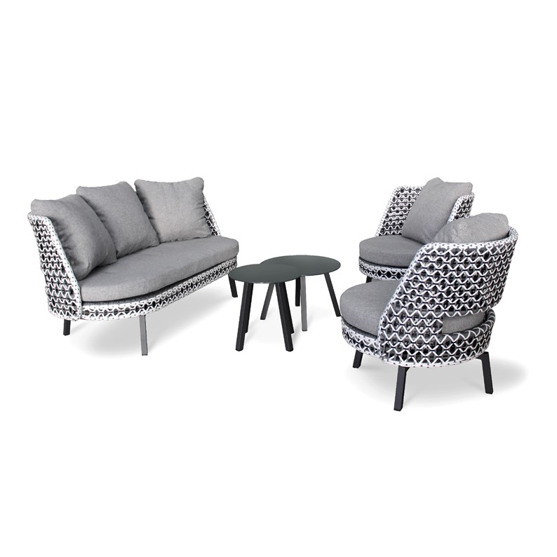 Salon de jardin AGADIR en aluminium et résine tressée, composé de : 1 canapé 2 places, 2 fauteuils avec assises rotatives, 2 tables basses. Coussins déhoussables 250 g/m² garni polyester (20kg/m3).