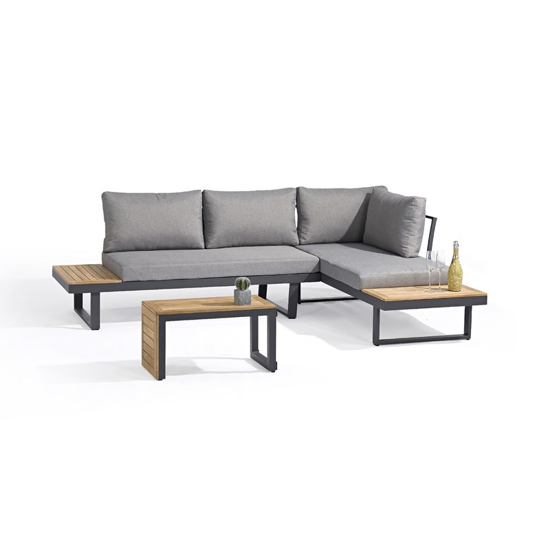 Salon de jardin TOKYO certifié FSC® 100% en bois d'acacia et structure aluminium, composé de 2 méridiennes 2 pl, d'une table basse. Coussins déhoussables 100% polyester gris clair. Salon modulable : version salon d'angle, lit, face à face, 2 banquettes.