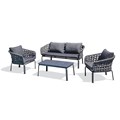 Salon de jardin CAMARGUE en aluminium gris anthracite et corde tissée, composé d'une table basse plateau céramique en sur verre, d'un canapé 2 places et de 2 fauteuils. Coussins déhoussables en toile 100% polyester gris.