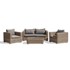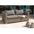 Salon de jardin MONTMARTRE en résine tressée miel, composé d'une banquette 2 places, de deux fauteuils et d'une table-basse avec plateau verre. Coussins déhoussables 250 g/m² garni polyester (20kg/m3).
