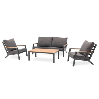 Salon de jardin KOMMOS en aluminium composé d'une table basse plateau en composite effet bois, d'un canapé 3 places, de 2 fauteuils, de 3 coussins d'assise et de 4 coussins de dossier, en toile Olefin.
