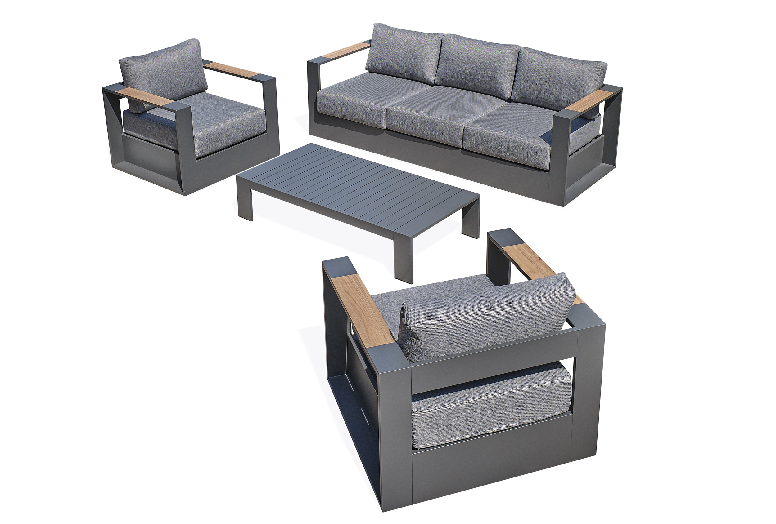 Salon de jardin MANDELIEU en aluminium avec accoudoirs en HPL composé de 1 canapé 2 places, 2 fauteuils, une table basse, 3 coussins d'assises et 4 coussins de dossier. Tous les coussins sont déhoussables.