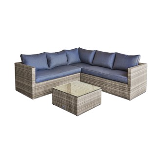 Salon de jardin BAVARO en résine tressée miel, composé de 2 méridiennes 2 places, un angle, une table. Coussins déhoussables en toile 100% polyester anthracite.