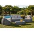 Salon de jardin PVC-ISA en résine tressée ronde et structure aluminium, composé d'une banquette 3 pl, de deux fauteuils et d'une table basse avec plateau verre. Coussins déhoussables 250 g/m² garni polyester (20kg/m3).