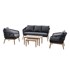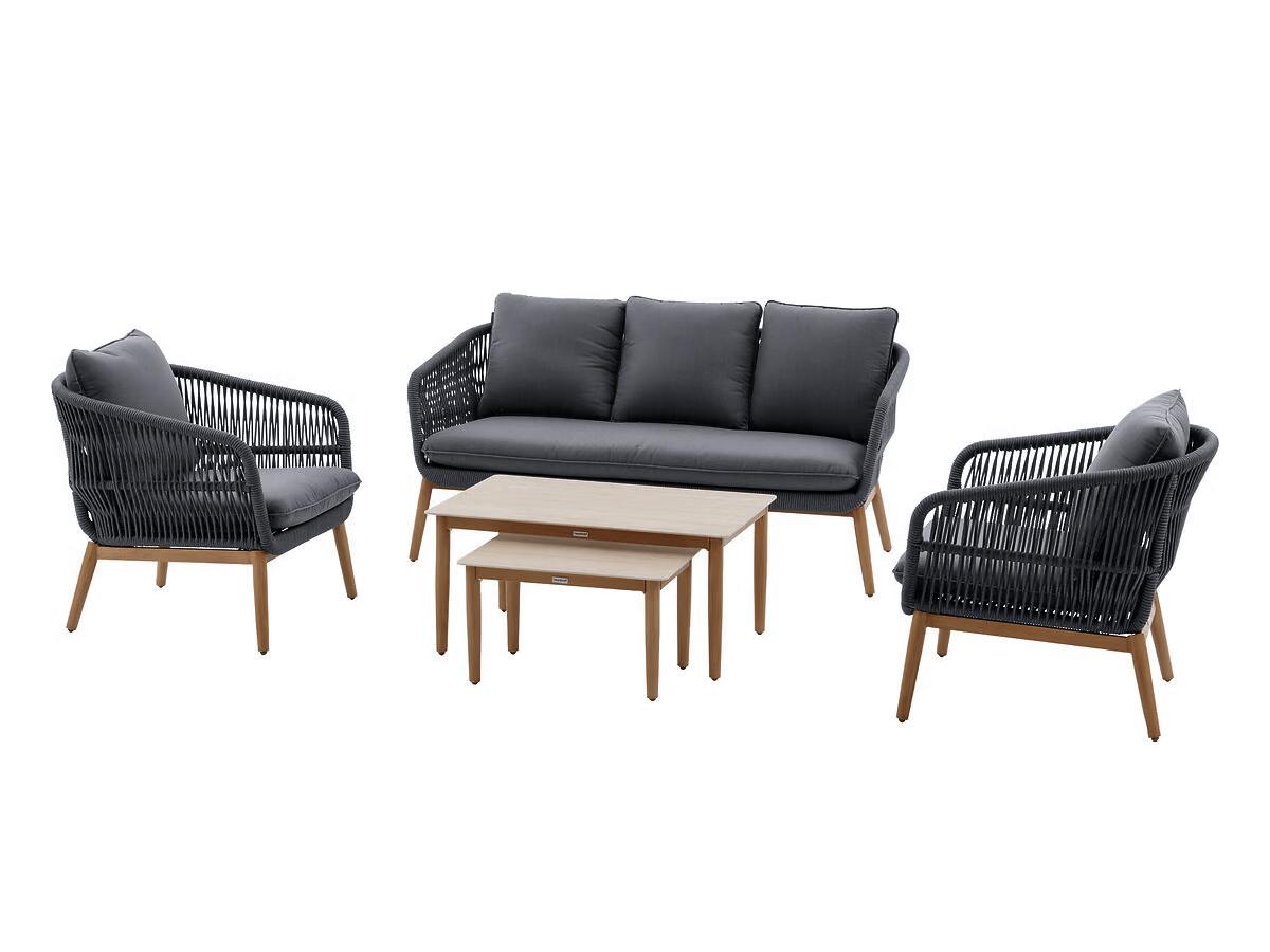 Le salon de jardin Orissa par Hespéride est une solution élégante et conviviale pour aménager un espace extérieur accueillant. Il comprend un canapé 3 places, deux fauteuils et deux tables basses gigognes, tous au design moderne avec un tressage effet bois brossé et des pieds évasés.