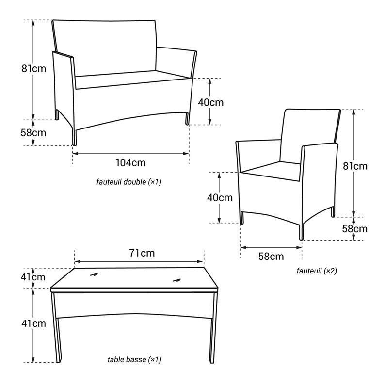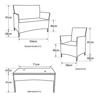 - Poids maximum supportés : 300kg (canapé) / 150kg (fauteuil) / 80kg (table)