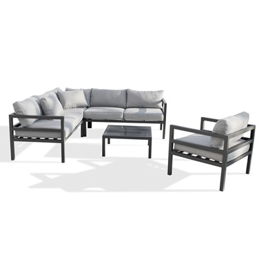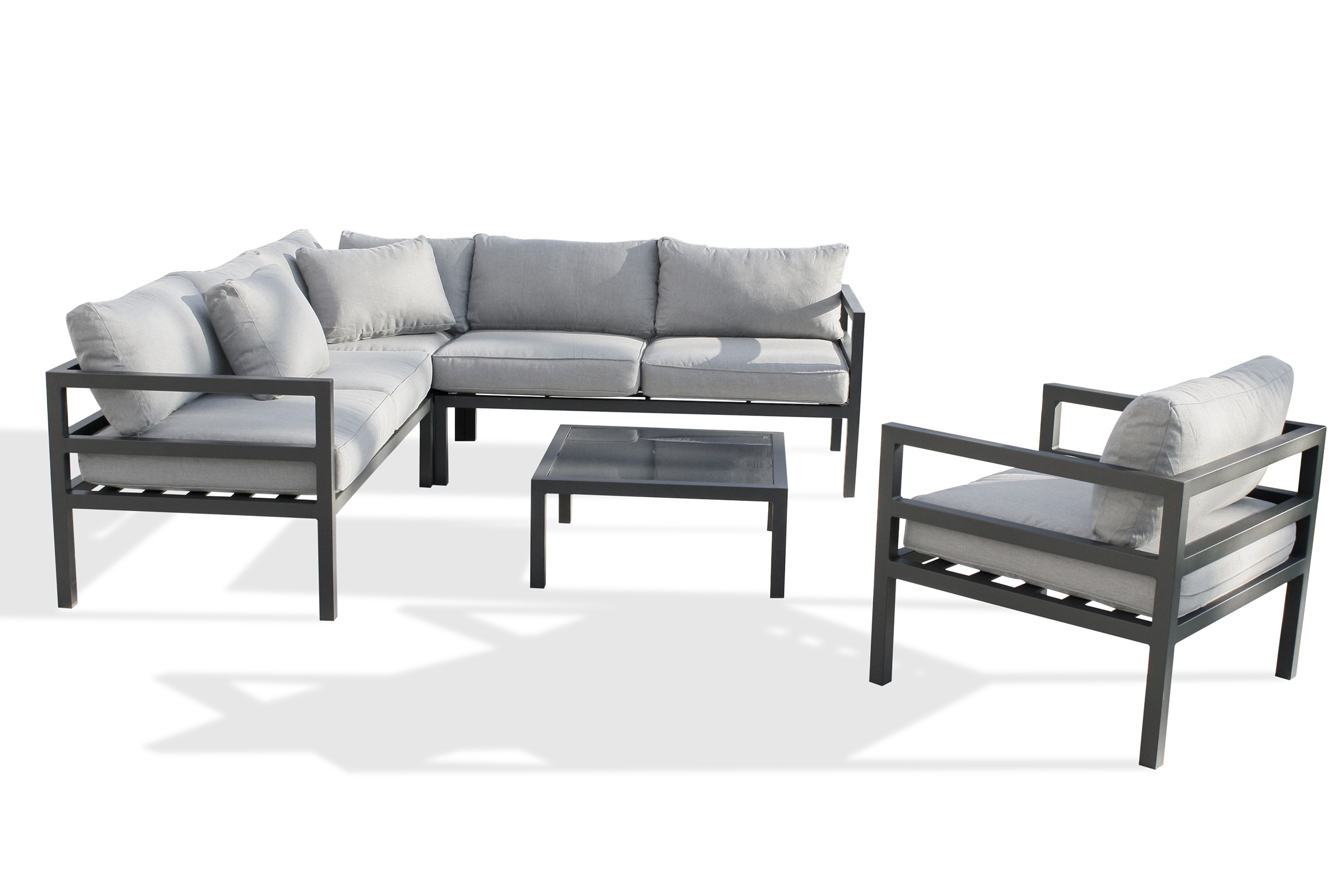 Salon de jardin BEAUBOURG en aluminium, composé d'une table basse carrée avec plateau verre, de 2 méridiennes 2 places, d'un angle et d'un fauteuil. Coussins déhoussables 250 g/m² garni polyester (20kg/m3).