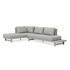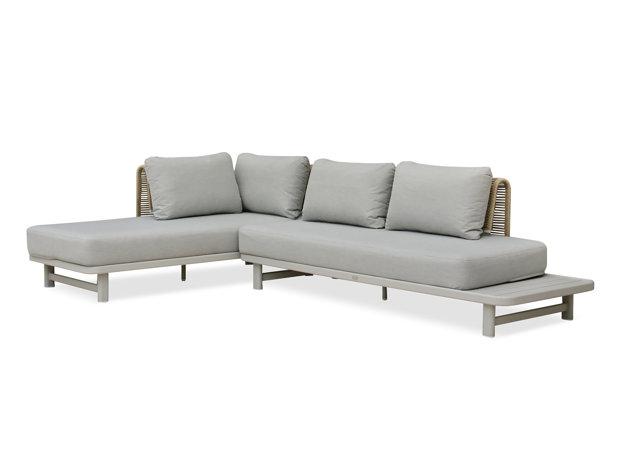 Salon de jardin d'angle IRUN 6 places en en corde tissée et aluminium gris mat, composé de 2 canapés 3 places, dont l'un agrémenté d'une tablette latérale. Coussins 100% polyester gris.