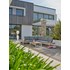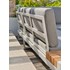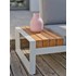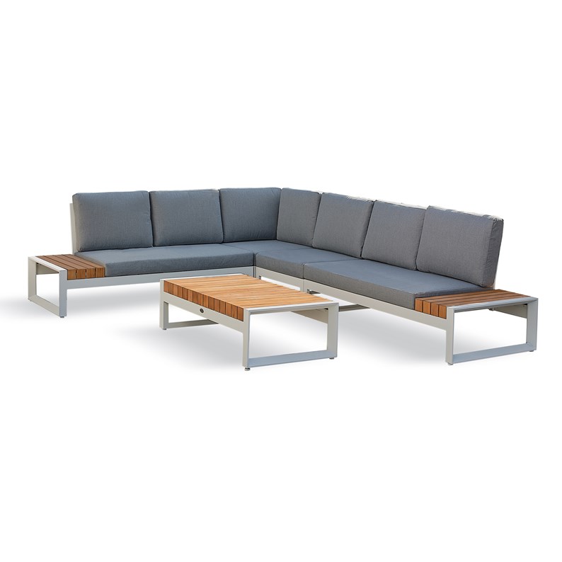 Salon de jardin d'angle VALENCIA 6 places en aluminium blanc, composé de 2 méridiennes 2 pl, 1 angle, 1 chauffeuse, 1 table basse avec plateau et 2 inserts décoratifs à lattes en teck. Coussins 100% polyester gris.