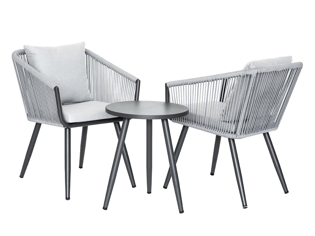 Le salon de jardin 2 personnes Amorgos se compose de deux fauteuils avec des cordes et d'une petite table ronde en aluminium. Ses coloris gris, noirs et ses coussins gris chiné apporteront résolument une touche raffinée à votre déco extérieure.