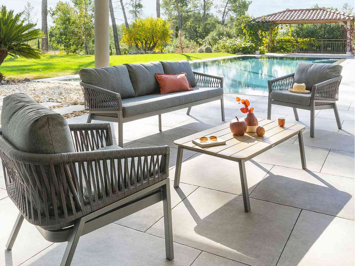 Le salon de jardin Oriengo présente un design contemporain avec sa structure en aluminium époxy, offrant à la fois robustesse et légèreté. Mais ce qui rend ce salon vraiment spécial, c'est son habillage en cordage acrylique, qui lui offre une touche singuliére et authentique. Ce cordage ajoute une texture intéressante à l'ensemble, créant une esthétique visuelle qui ne manquera pas de faire sensation dans votre jardin ou sur votre terrasse.