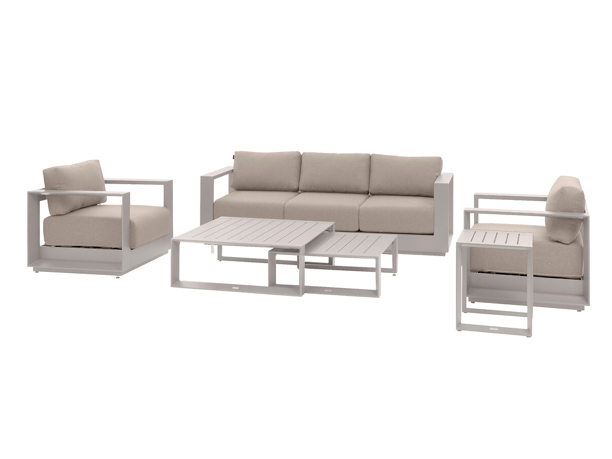Le canapé, avec des dimensions de 219 x 80 x 82 cm, offre amplement de place pour se détendre, tandis que les deux fauteuils de 89 x 80 x 82 cm apportent un confort supplémentaire. Les tables en aluminium traité époxy complètent l'ensemble avec une grande table basse de 97 x 97 x 36 cm, une petite table basse de 79 x 79 x 30 cm et une table d'appoint de 44 x 44 x 55 cm, idéales pour vos repas ou moments conviviaux en extérieur.
