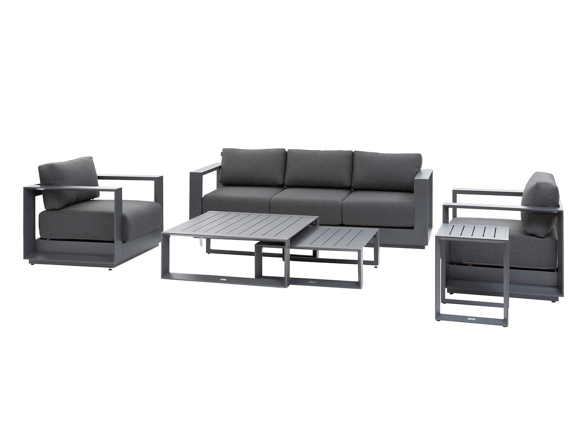 Le canapé, avec des dimensions de 219 x 80 x 82 cm, offre amplement de place pour se détendre, tandis que les deux fauteuils de 89 x 80 x 82 cm apportent un confort supplémentaire. Les tables en aluminium traité époxy complètent l'ensemble avec une grande table basse de 97 x 97 x 36 cm, une petite table basse de 79 x 79 x 30 cm et une table d'appoint de 44 x 44 x 55 cm, idéales pour vos repas ou moments conviviaux en extérieur.