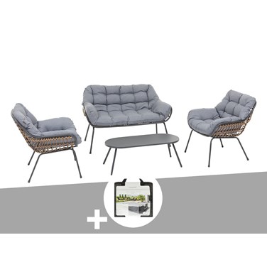 Le salon de jardin PaoPao Hespéride associe fonctionnalité et esthétique contemporaine. Avec une structure en acier traité époxy assurant une solidité et une longévité remarquables, et un habillage en résine synthétique tressée apportant une touche de modernité à votre espace extérieur. Les coussins en polyester, résistants aux intempéries, offrent un confort douillet, vous permettant de profiter pleinement de votre extérieur. Avec un canapé deux places et deux fauteuils spacieux invitant à la détente, ainsi qu'une table basse pratique, ce salon de jardin est conçu pour créer des moments de relaxation en plein air.