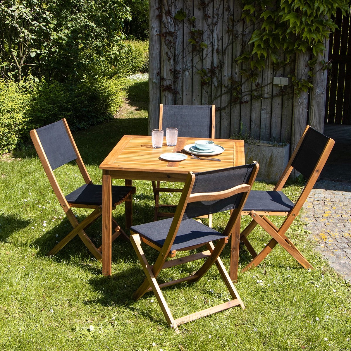 Ce petit salon de jardin dispose d'une table carré en acacia massif et 4 chaises en textilène noir et acacia, ensemble ils vous invitent à partager d'agréables moments autour d'un repas. Un design intemporel, épuré et des courbes simples empreintes de douceur. Grâce à son bois, ce salon est robuste et résistera très bien aux petits coups de la vie. Il apportera de la modernité et de l'esthétisme à votre terrasse ou votre jardin. Caractéristiques : Matière : Acacia et textilène - Couleur : Naturel et noir - Chaises : 50 x 58 x 90 cm - Table : 90 cm / Hauteur 75 cm - Poids : 28 kg - Garantie : 5 ans - Particularité : Assise en textilène - Montage : Pieds de la table à monter. Comporte 4 chaises, 1 table. Les + : Table carrée – Chaises pliantes – Bois d'acacia.