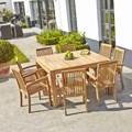 Chic et raffiné, ce salon en teck brut de qualité premium est fait pour votre jardin ! Composé d'une table carrée et de 8 fauteuils empilables, ce salon accueillera vos convives de manière confortable tout en profitant des rayons du soleil. Conçu en Teck massif Brut, ce salon est également muni d'un trou pour le parasol. Ce petit bijou, vous fera profiter durablement des beaux jours ! Caractéristiques : Matière : Teck brut de qualité premium - Couleur : Naturel - Fauteuils : Profondeur 44 cm x largeur 53 cm x Hauteur 91 cm - Table : Longueur 140 cm x Largeur 140 cm x Hauteur 75 cm - Poids : 110 kg - Garantie : 5 ans - Montage : Pieds de la table à monter. Les + : Fauteuils empilables – Visserie laiton – Épaisseur plateau table 3 cm. Comporte 1 table et 8 fauteuils.