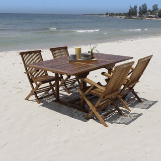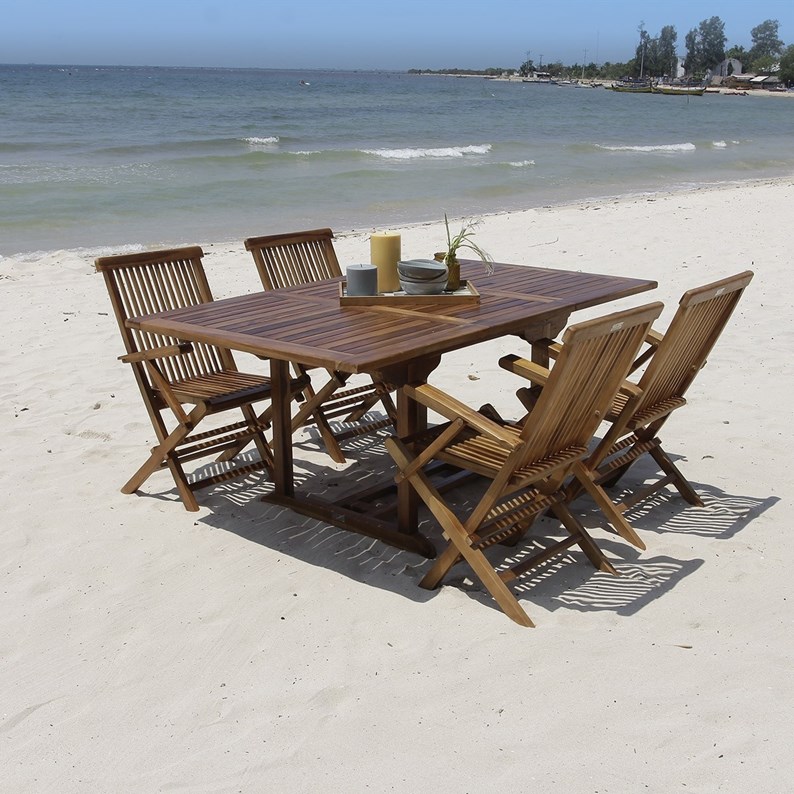Terrasse et balcon accueilleront idéalement cet ensemble de jardin pouvant recevoir de 4 à 8 convives ! Table rectangulaire, rallonge papillon escamotable et chaises pliantes, l'opération gagnante pour toutes vos tablées, petites ou grandes ! Ce salon de jardin est fabriqué en teck huilé qui lui donne une teinte miel chaleureuse et douce. Caractéristiques : Matière : Teck huilé - Couleur : Marron - Fauteuils : Profondeur 41 cm x Longueur 51 cm x Hauteur 90 cm - Table : Longueur 120/170 cm x largeur 100 cm x Hauteur 75 cm - Poids : 67 kg - Garantie : 5 ans - Montage : Pieds de la table à monter. Les + : Fauteuils pliants – Visserie laiton– Rallonge papillon de 50 cm - Épaisseur du plateau : 2,5 cm.