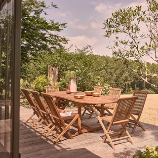 Ce salon de jardin en teck huilé peut accueillir jusqu'à 10 personnes. Il est composé d'une table ovale et de 8 chaises pliantes en teck huilé qui s'harmonisent parfaitement. La table en teck huilé est équipée d'un trou de parasol et d'une rallonge papillon escamotable de 60 cm. Ses dimensions et sa modularité en font le salon idéal pour votre famille et vos amis.