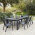Ce salon de jardin en aluminium et textilène noir est composé de 8 fauteuils ainsi que d'une grande table au caractère prononcé. Caractéristiques : Matière : aluminium - Couleur : noir - Poids : 83 kg - Table : Hauteur : 76 cm - Longueur : 280 cm - Largeur : 100 cm - Fauteuils : - Largeur assise : 61 cm - Profondeur assise : 57 cm- Hauteur : 87 cm - Garantie : 5 ans - Montage : Pieds à monter. Comporte : 1 table et 8 fauteuils. Les + : Aluminium – Confort – Style unique.
