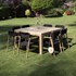 Chic et raffiné, ce salon en teck brut de qualité premium est fait pour votre jardin ! Composé d'une table carrée et de 8 fauteuils empilables, ce salon accueillera vos convives de manière confortable tout en profitant des rayons du soleil. Conçu en Teck massif Brut, ce salon est également muni d'un trou pour le parasol. Ce petit bijou, vous fera profiter durablement des beaux jours ! Caractéristiques : FAUTEUIL : Matière : teck et cordage - Couleur : naturel - Hauteur : 82 cm - Largeur assise : 60 cm - Profondeur assise : 65 cm - Poids : 9 kg - Garantie : 2 ans - Montage : Livré monté. TABLE : Longueur 140 cm x Largeur 140 cm x Hauteur 75 cm - Poids : 110 kg - Garantie : 5 ans - Montage : Pieds de la table à monter. Les + : Fauteuils empilables – Visserie laiton – Épaisseur plateau table 3 cm. Comporte : 1 table et 8 fauteuils.