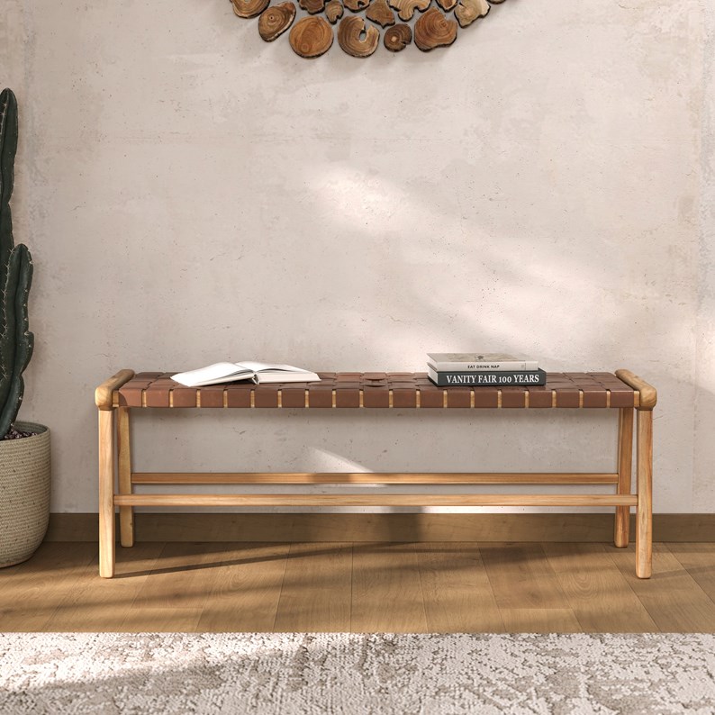 Banc 120 cm en cuir tressé marron et bois de teck - kuna