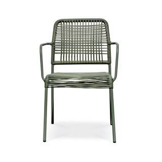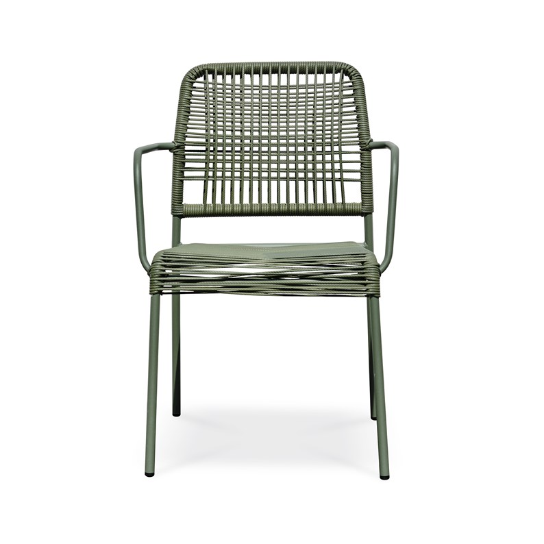 Fauteuil de jardin MARCEAU empilable avec une structure en acier vert olive et une assise et un dossier en corde tissée.