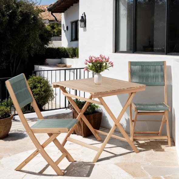 Le revêtement en corde verte ajoute une note de modernité et de confort. Les chaises ont des dimensions de 43x59x86 cm, avec une hauteur d'assise de 43 cm et une profondeur d'assise de 40 cm, offrant ainsi une ambiance de campagne pour votre espace extérieur.