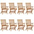 Cet ensemble de chaises de jardin en bois se compose de 8 pièces et est destiné à être un excellent supplément à votre jardin, terrasse ou patio. Vous pouvez vous détendre et discuter avec la famille et les amis ou profiter du bon temps. Fabriquée en bois dur de teck extrêmement durable, cette pièce de meuble en teck a été chevronnée, séchée au four puis finement poncée pour lui donner un aspect très lisse. Le bois de teck est connu pour sa résistance exceptionnelle aux intempéries, ce qui le rend bien plus adapté aux meubles de jardin que tout autre type de bois. Le bois de teck est le choix idéal si vous souhaitez acheter une pièce de meubles de jardin durable. La surface poncée est facile à nettoyer avec un chiffon humide. Ces chaises d'extérieur sont également légères, ce qui les rend complètement flexibles et faciles à déplacer. Les chaises en bois peuvent être pliées pour gagner de la place lorsqu'elles ne sont pas utilisées. De plus, les coussins de siège inclus bien rembourrés offrent également un confort d'assise supplémentaire. Remarque : afin de prolonger la durée de vie des meubles d'extérieur, nous vous recommandons de les protéger avec une housse imperméable.