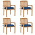 Ajoutez une touche de charme rustique à votre salle à manger, jardin ou terrasse avec cet ensemble de chaises de jardin empilables avec ensemble de coussins ! La chaise de salle à manger élève votre espace de vie intérieur ou extérieur à un niveau supérieur avec un design à lattes et élégant. Cet ensemble de meubles en teck est fabriqué à partir de bois dur de teck extrêmement durable et est chevronné, séché au four et poncé finement pour lui donner un aspect très lisse. Le bois de teck est connu pour sa solidité et sa résistance aux intempéries exceptionnelles, ce qui le rend bien plus adapté aux meubles de jardin que tout autre type de bois. Le bois de teck est le choix parfait si vous souhaitez acheter un meuble de jardin durable. Il est facile à entretenir et à nettoyer avec un chiffon humide. De plus, la chaise de salle à manger peut être empilée pour économiser de l'espace de stockage lorsqu'elle n'est pas utilisée. De plus, les coussins inclus offrent un confort supplémentaire. Chaque coussin a 2 jeux de cordes pour le fixer fermement sur la chaise. Remarque : afin de prolonger la durée de vie de vos meubles d'extérieur, nous vous recommandons de les nettoyer régulièrement et de ne pas les laisser à l'extérieur sans protection inutilement.Nettoyage : utiliser une solution savonneuse douceStockage : si possible, stockez dans un endroit frais et sec à l'intérieur. Si le produit est stocké à l'extérieur, protégez-le avec une housse imperméable. Essuyez et séchez l'excès d'eau ou de neige des surfaces planes après la pluie ou une chute de neige. Permettez une circulation d'air suffisante afin d'éviter les dommages liés à l'humidité.