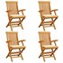 Cet ensemble de chaises de jardin en bois se compose de 4 pièces et est destiné à être un excellent supplément à votre jardin, terrasse ou patio. Vous pouvez vous détendre et discuter avec la famille et les amis ou profiter du bon temps. Fabriquée en bois dur de teck extrêmement durable, cette pièce de meuble en teck a été chevronnée, séchée au four puis finement poncée pour lui donner un aspect très lisse. Le bois de teck est connu pour sa résistance exceptionnelle aux intempéries, ce qui le rend bien plus adapté aux meubles de jardin que tout autre type de bois. Le bois de teck est le choix idéal si vous souhaitez acheter une pièce de meubles de jardin durable. La surface poncée est facile à nettoyer avec un chiffon humide. Ces chaises d'extérieur sont également légères, ce qui les rend complètement flexibles et faciles à déplacer. Les chaises en bois peuvent être pliées pour gagner de la place lorsqu'elles ne sont pas utilisées. De plus, les coussins de siège inclus offrent également un confort d'assise supplémentaire.