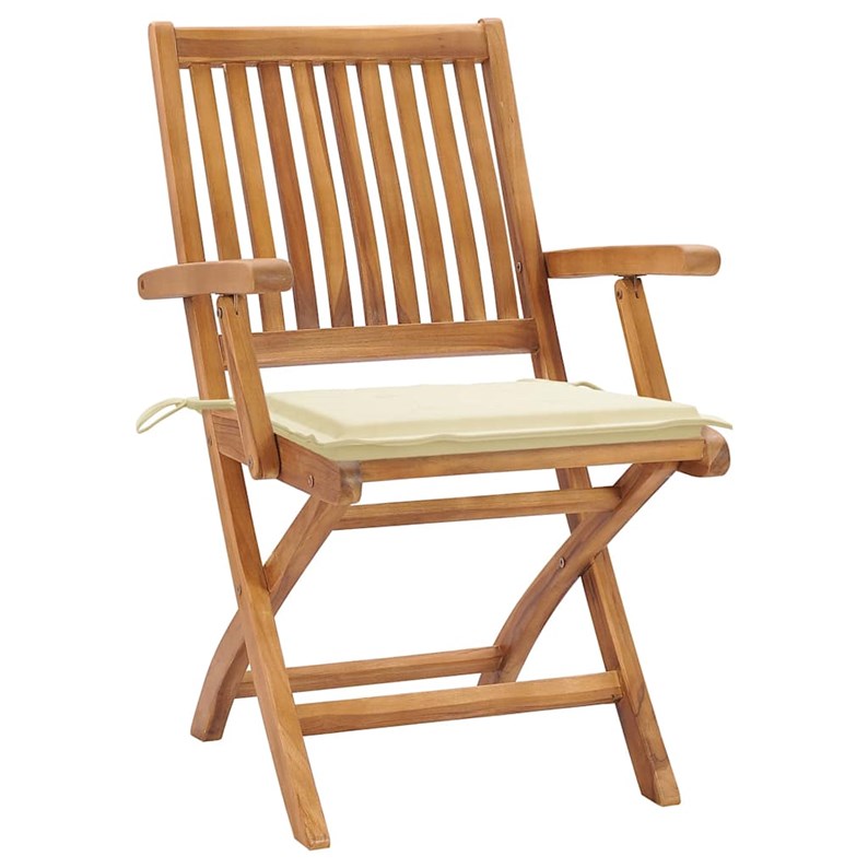 Cet ensemble de chaises de jardin en bois présente un design intemporel. Les chaises d’extérieur conviennent à tous les environnements, tels que les maisons, les bureaux, les bars et les cafés, grâce à leur design simple mais élégant. Fabriqué en bois dur de teck extrêmement durable, cet ensemble de meubles en teck a été chevronné, séché au four puis finement poncé pour lui donner un aspect très lisse. Le bois de teck est connu pour sa résistance exceptionnelle aux intempéries, ce qui le rend bien plus adapté aux meubles de jardin que tout autre type de bois. Le bois de teck est le choix idéal si vous souhaitez acheter un meuble de jardin durable. Grâce à la surface sablée, les chaises de salle à manger sont résistantes aux intempéries et faciles à nettoyer. Elles peuvent également être pliées pour économiser de l’espace de stockage lorsqu'elles ne sont pas utilisées. De plus, les coussins fournis offrent un confort supplémentaire. Chaque coussin dispose de 2 ensembles de cordes pour le fixer solidement sur la chaise. Remarque : afin de prolonger la durée de vie de vos meubles d'extérieur, nous vous recommandons de les nettoyer régulièrement et de ne pas les laisser à l'extérieur sans protection inutilement.Nettoyage : utiliser une solution savonneuse douceStockage : si possible, stockez dans un endroit frais et sec à l'intérieur. Si le produit est stocké à l'extérieur, protégez-le avec une housse imperméable. Essuyez et séchez l'excès d'eau ou de neige des surfaces planes après la pluie ou une chute de neige. Permettez une circulation d'air suffisante afin d'éviter les dommages liés à l'humidité.