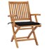 Cet ensemble de chaises de jardin en bois présente un design intemporel. Les chaises d’extérieur conviennent à tous les environnements, tels que les maisons, les bureaux, les bars et les cafés, grâce à leur design simple mais élégant. Fabriqué en bois dur de teck extrêmement durable, cet ensemble de meubles en teck a été chevronné, séché au four puis finement poncé pour lui donner un aspect très lisse. Le bois de teck est connu pour sa résistance exceptionnelle aux intempéries, ce qui le rend bien plus adapté aux meubles de jardin que tout autre type de bois. Le bois de teck est le choix idéal si vous souhaitez acheter un meuble de jardin durable. Grâce à la surface sablée, les chaises de salle à manger sont résistantes aux intempéries et faciles à nettoyer. Elles peuvent également être pliées pour économiser de l’espace de stockage lorsqu'elles ne sont pas utilisées. De plus, les coussins fournis offrent un confort supplémentaire. Chaque coussin dispose de 2 ensembles de cordes pour le fixer solidement sur la chaise. Remarque : afin de prolonger la durée de vie de vos meubles d'extérieur, nous vous recommandons de les nettoyer régulièrement et de ne pas les laisser à l'extérieur sans protection inutilement.Nettoyage : utiliser une solution savonneuse douceStockage : si possible, stockez dans un endroit frais et sec à l'intérieur. Si le produit est stocké à l'extérieur, protégez-le avec une housse imperméable. Essuyez et séchez l'excès d'eau ou de neige des surfaces planes après la pluie ou une chute de neige. Permettez une circulation d'air suffisante afin d'éviter les dommages liés à l'humidité.
