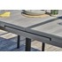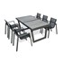 Ensemble repas de jardin OLHOS composé d'une table en aluminium gris anthracite avec pieds en U pour look intemporel et de 6 fauteuils MIAMI empilables en toile plastifiée noire et structure en aluminium gris anthracite. Table équipée d'une rallonge automatique et d'un plateau de table en céramique.
