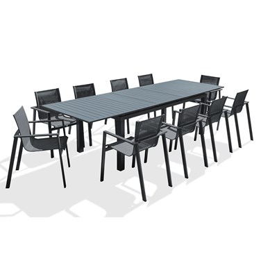 Ensemble repas MIAMI en aluminium composé d'une table avec rallonge automatique et de 10 fauteuils empilables en toile plastifiée et structure aluminium.