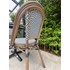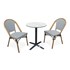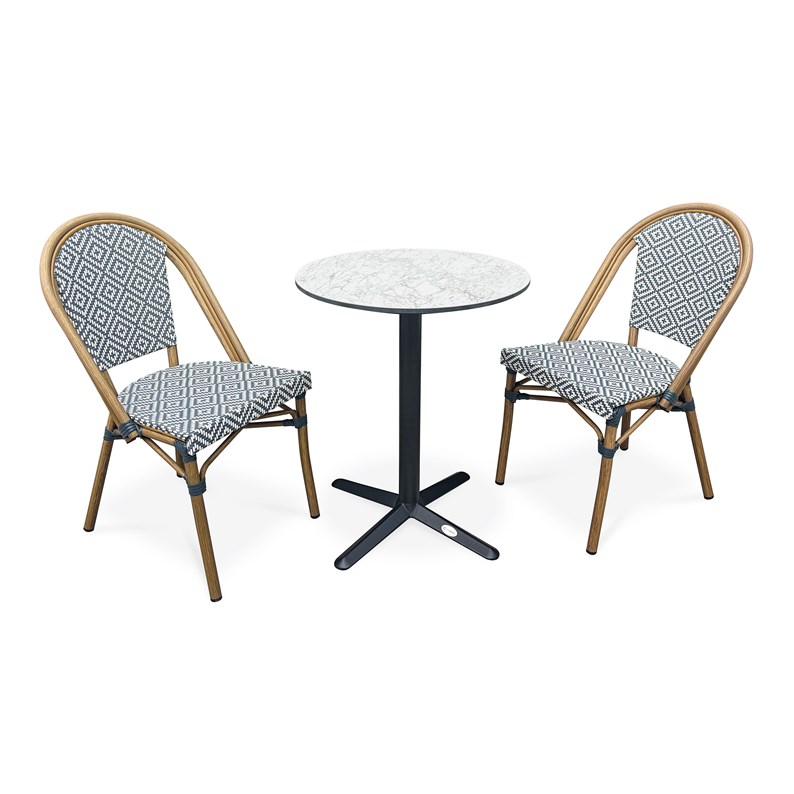 Ensemble repas de jardin BISTRO composé d'une table ronde en acier noir et plateau HPL effet marbre blanc, et de 2 fauteuils de jardin empilables, en aluminium effet bois et textilène de couleur bleu et blanc.