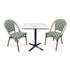 Ensemble repas de jardin BISTRO composé d'une table carrée en acier noir et plateau HPL effet marbre blanc, et de 2 fauteuils de jardin empilables, en aluminium effet bois et textilène de couleur vert et blanc.