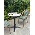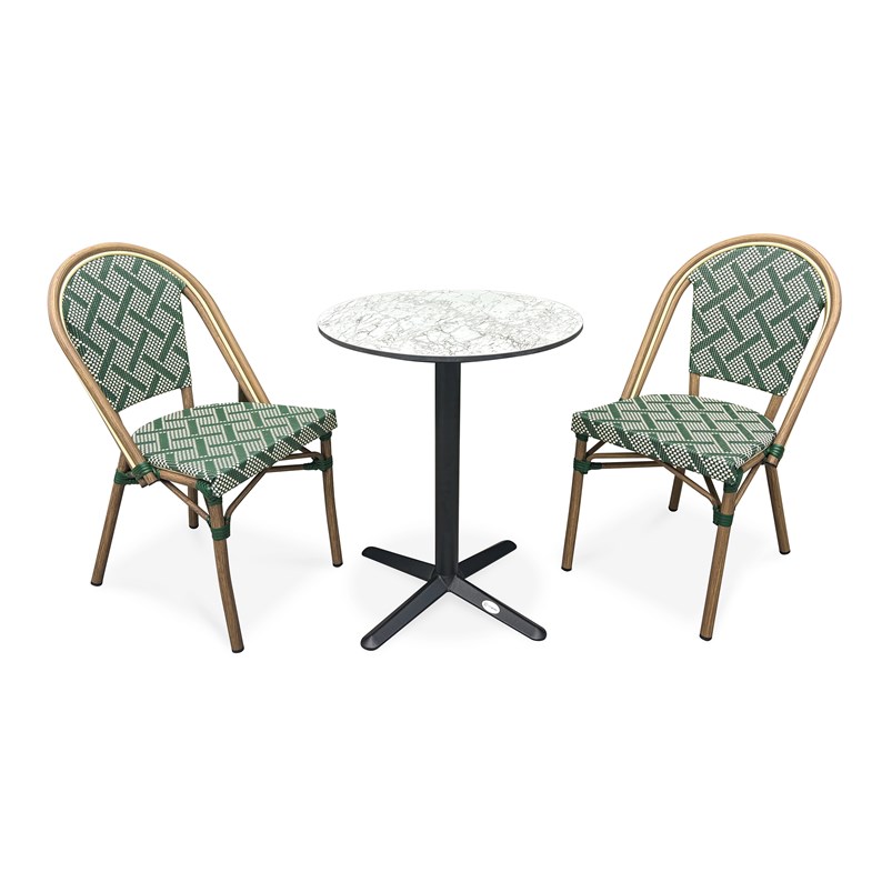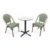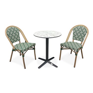 Ensemble repas de jardin BISTRO composé d'une table ronde en acier noir et plateau HPL effet marbre blanc, et de 2 fauteuils de jardin empilables, en aluminium effet bois et textilène de couleur vert et blanc.
